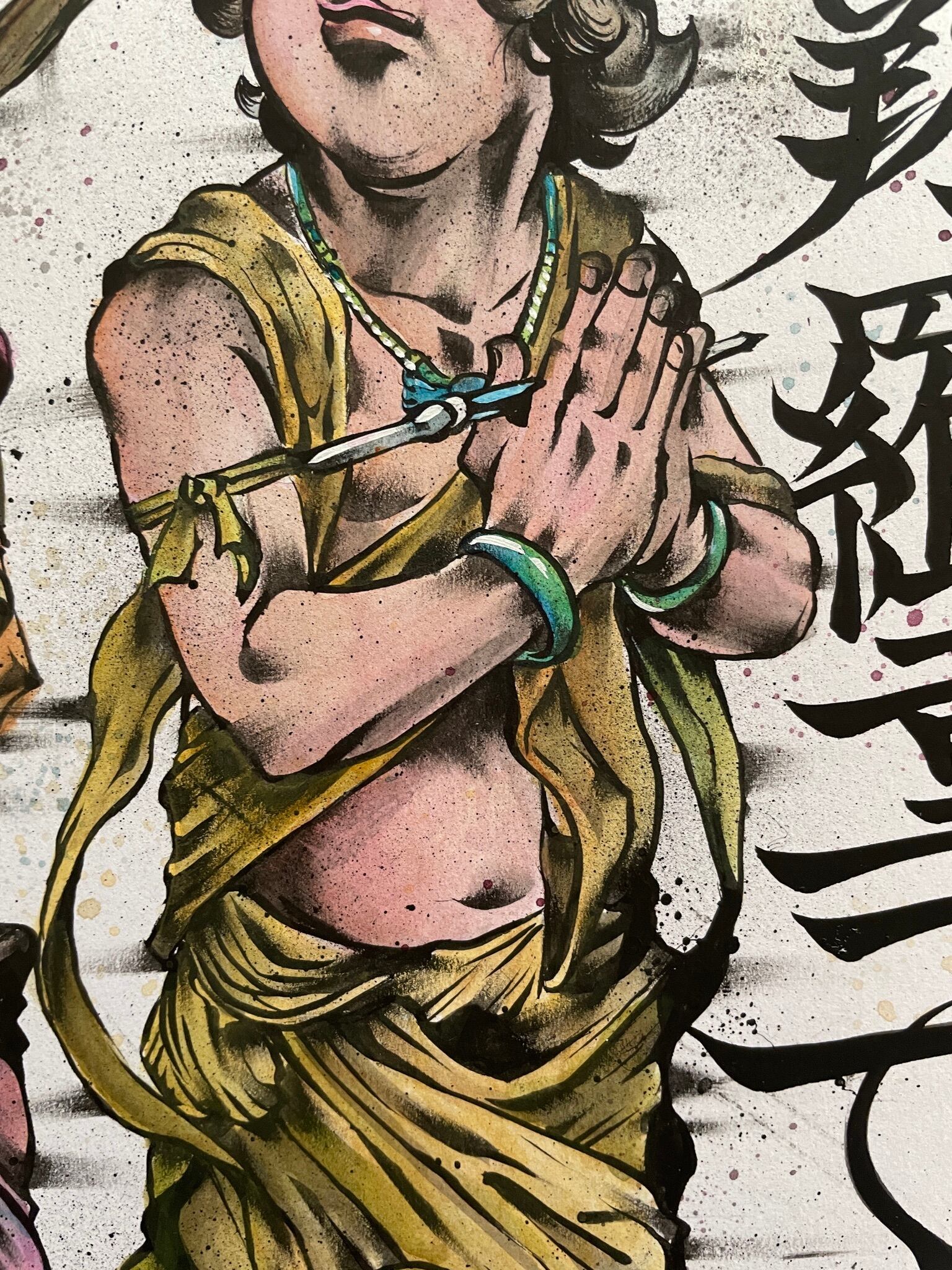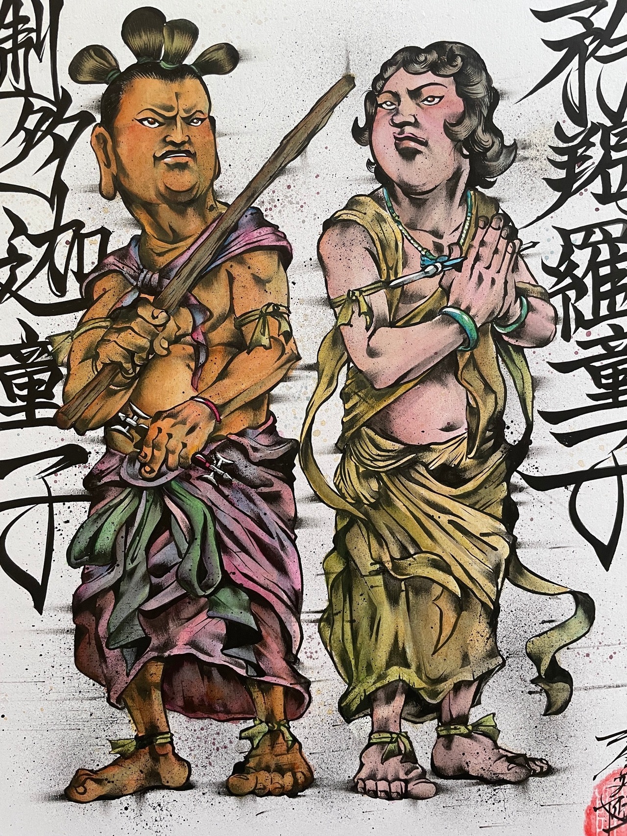 彩色描画【脇士 矜羯羅童子 制多迦童子】額装付