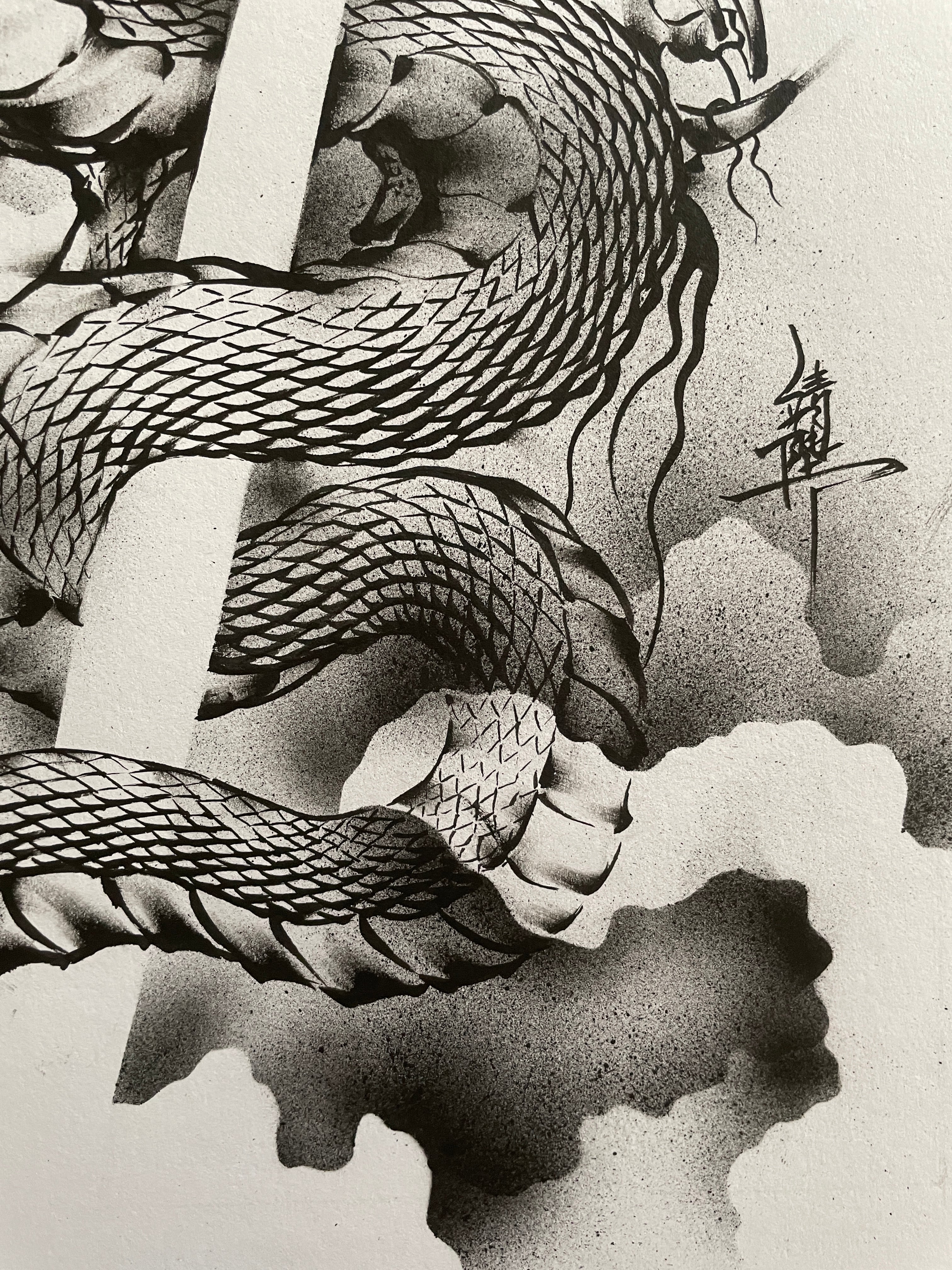 紙に雲龍。一瞬でも自分に輝きを感じたならば、その道を脇目も振らず直向きに進むべし。何かに挑戦や目指す方の背中を後押ししてくれる作品となってほしい。(作家談)