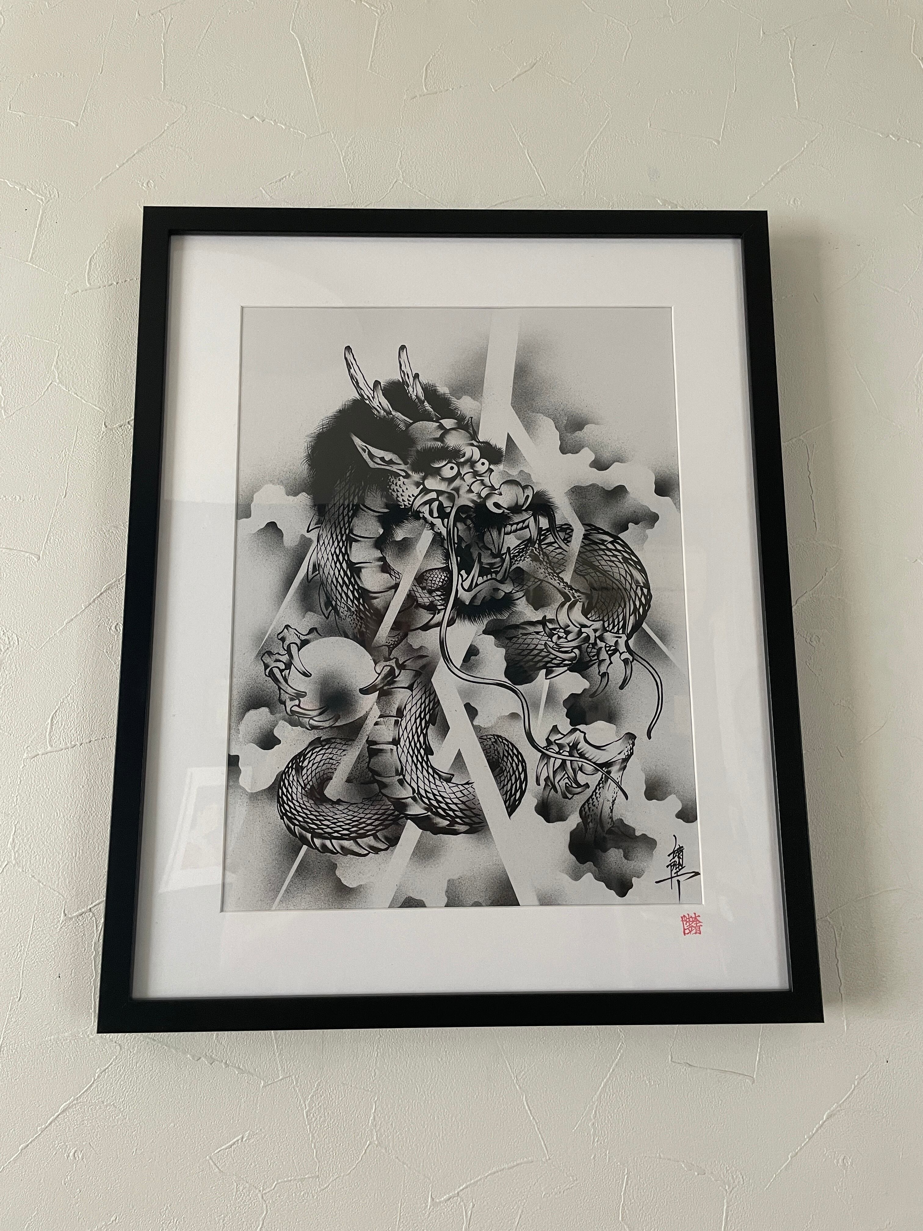 紙に雲龍。雷の閃光と共に龍神が姿を現す。突如鳴り響く雷を霹靂神(はたたがみ)と呼ぶ。雷=神鳴り、雷鳴轟くところに間違いなく神が存在する。(作家談)