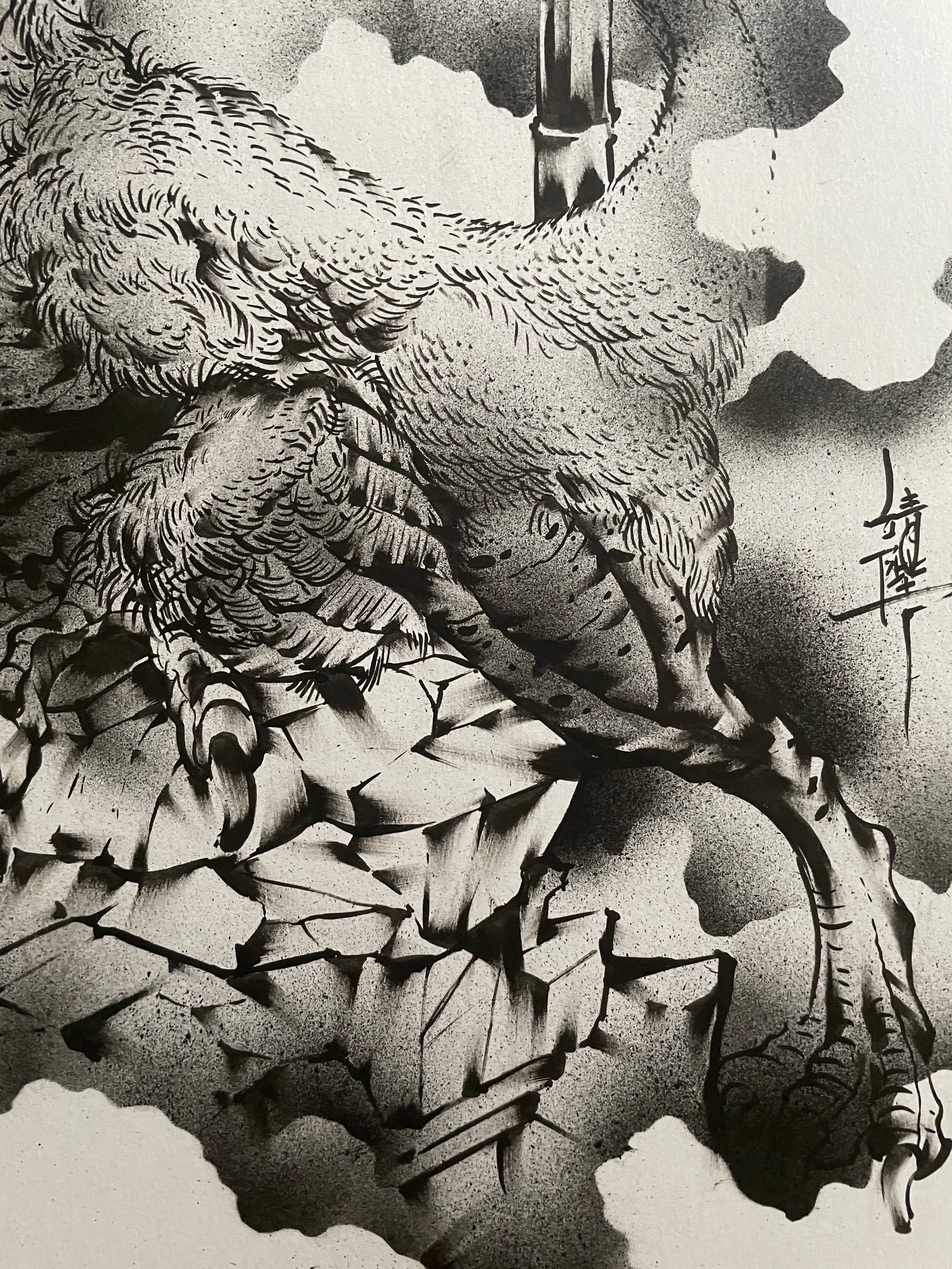 紙に恐竜。ヴェロキラプトルは東アジアに存在した小型羽毛恐竜。アジアの恐竜ということで、竹林と岩、満月の夜に徘徊姿を描いてみた。竹はあったのかな?そういえば、この恐竜はジュラシックパークでも登場したけど、羽毛恐竜としては描かれてなかったね。(作家談)